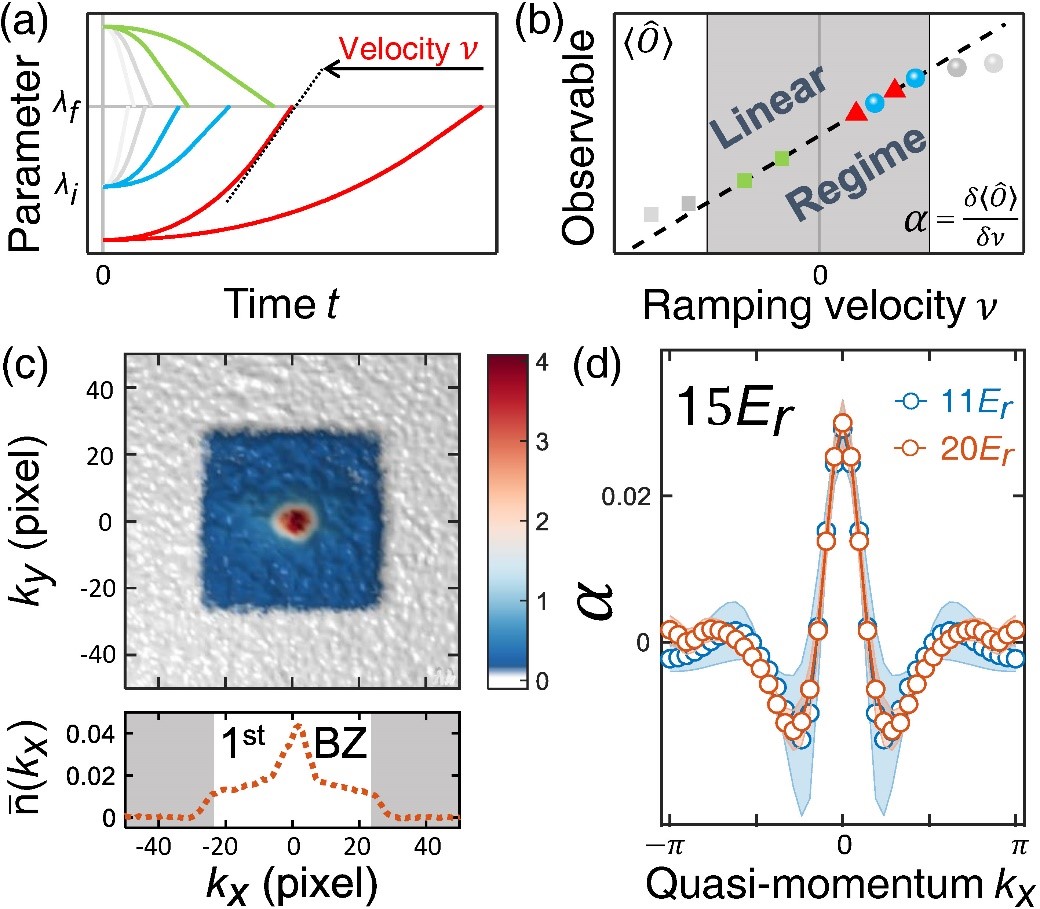 实验上,该工作利用了冷原子光晶格实验平台。该团队运用改良的能带映射方法,精准地测量出体系的准动量分布。在此基础上,以不同的速率改变光晶格的势能深度,观测到准粒子动量分布的相应变化。该实验正是凭借这些优势,验证了非绝热线性响应理论。这样一种冷原子系统,在不同光晶格深度下会表现出玻色超流、玻色莫特绝缘态和量子相变临界状态等不同的量子状态。利用这一特点,该实验标定了这个系统中不同物态之间不同的准粒子行为。