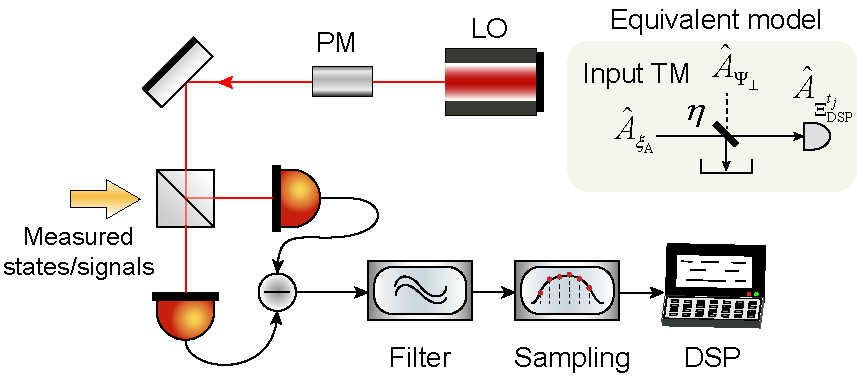 数字化CVQKD系统是在接收端进行相干探测后引入数字信号处理,其安全性分析的困难之处在于,超高速调制引入的频谱展宽现象将实际量子态从单模假设推向了连续模式光场情况,因此,已不满足传统CVQKD安全性分析的单模光场假设,且DSP算法会进一步对探测结果的时域、频域特性进行修正,导致正则分量探测定义的复杂。